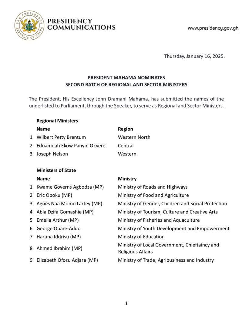 President John Dramani Mahama has submitted the names of his second batch of nominated regional and sector ministers to Parliament for approval.