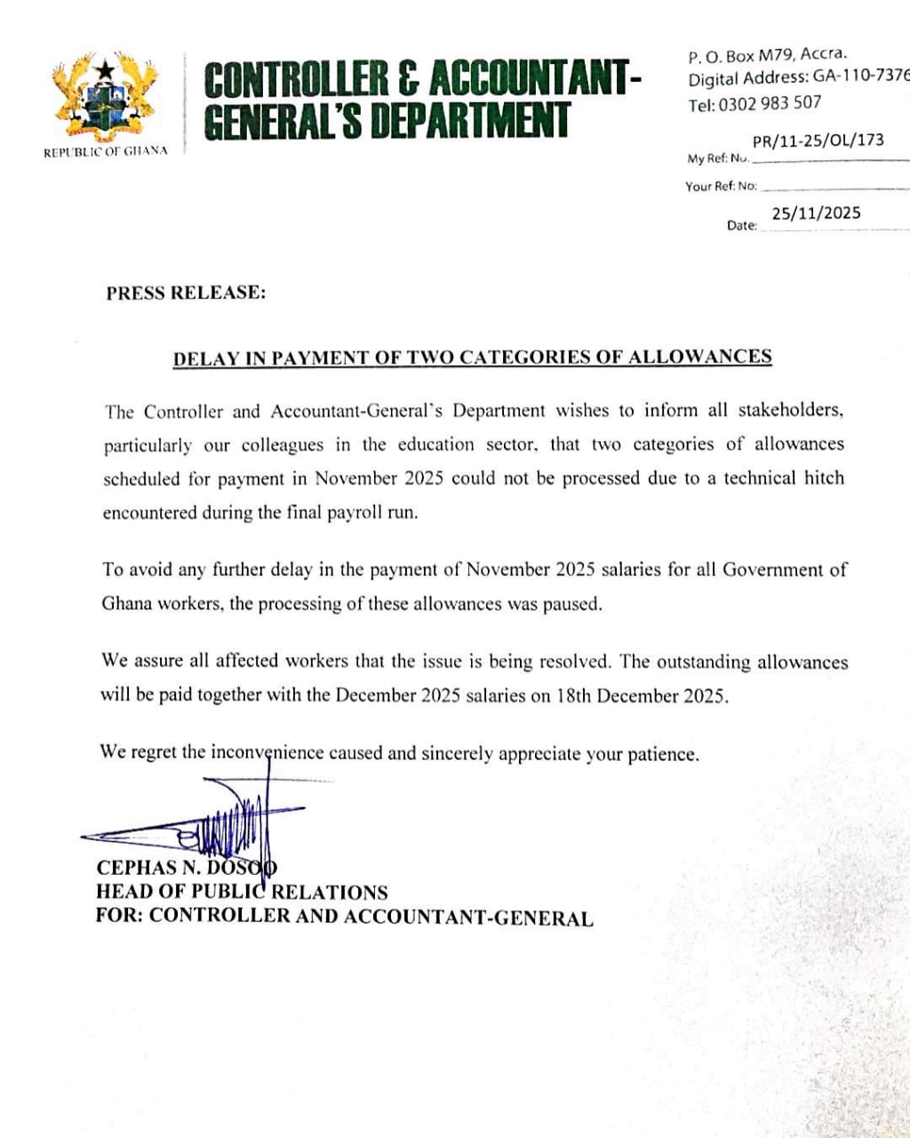 “The processing of these allowances was paused to avoid any further delay in the payment of November 2025 salaries for all Government of Ghana workers,” the Department said, adding that teams are currently working to resolve the issue.