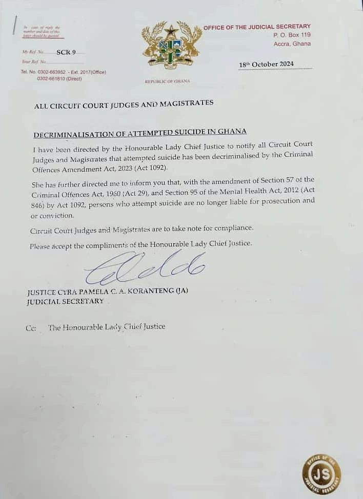 In a letter dated October 18, 2024, signed by the Judicial Secretary, Justice Cyra Pamela Koranteng, and addressed to all circuit court judges and magistrates, they were reminded about the decriminalisation of attempted suicide by the Criminal Offences Amendment Act of 2023.