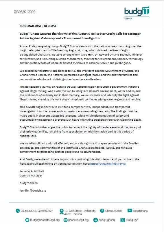 Civic watchdog BudgIT Ghana has joined the nation in mourning the victims of the August 6 military helicopter crash while calling for stronger action against illegal mining and a transparent inquiry into the disaster.