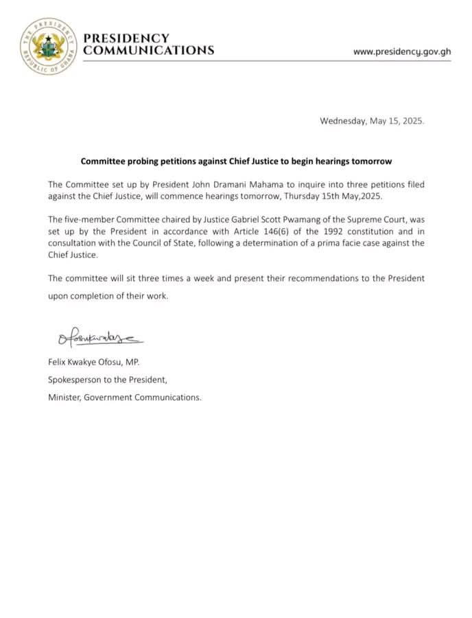 The five-member committee established by President John Dramani Mahama to investigate three petitions filed against the Chief Justice will commence its hearings on Thursday, May 16, 2025.