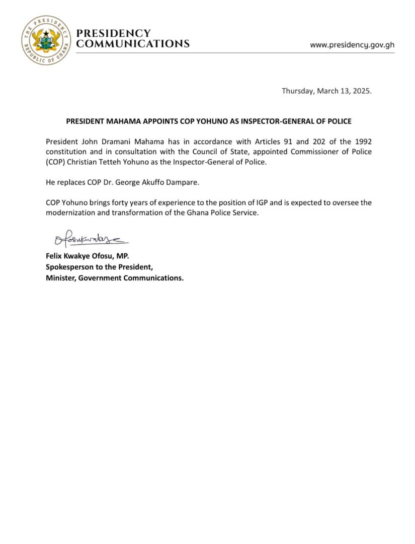 In a statement from the Minister for Government Communications on Thursday, March 13, 2025, Dr. Dampare’s removal takes immediate effect, clearing the way for the likely swearing-in of newly appointed IGP Christian Tetteh Yohuno on Friday, March 14.