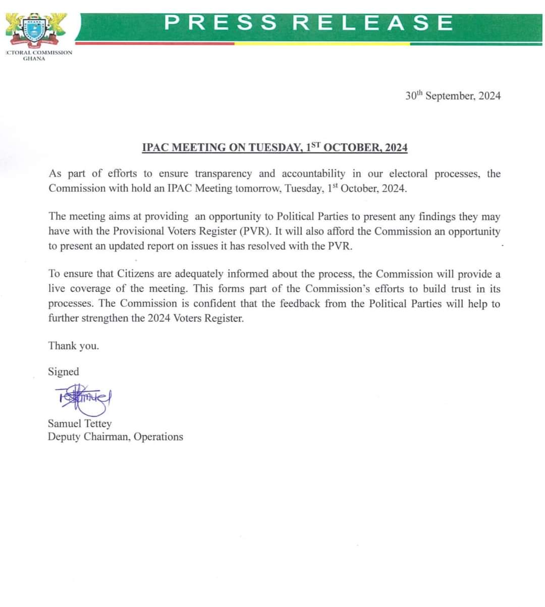 The Electoral Commission (EC) has announced plans to hold a critical Inter-Party Advisory Committee (IPAC) meeting on Tuesday, 1st October 2024, as part of its ongoing commitment to ensuring transparency and accountability in the country’s electoral process.