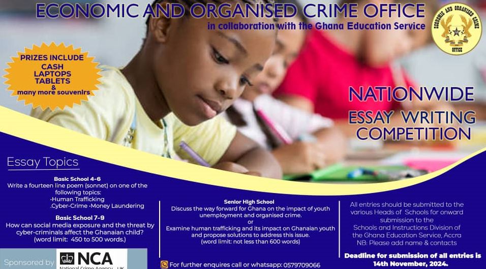 The Economic and Organised Crimes Office (EOCO), in partnership with the Ghana Education Service (GES), has launched a nationwide essay writing competition to raise awareness about key issues affecting society, including human trafficking, cybercrime, and money laundering.