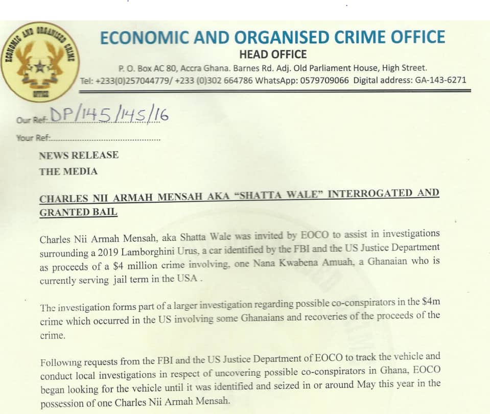 The Economic and Organised Crime Office (EOCO) has interrogated Ghanaian dancehall artiste Charles Nii Armah Mensah, popularly known as Shatta Wale, in connection with a Lamborghini Urus identified by US authorities as proceeds of a $4 million fraud case.