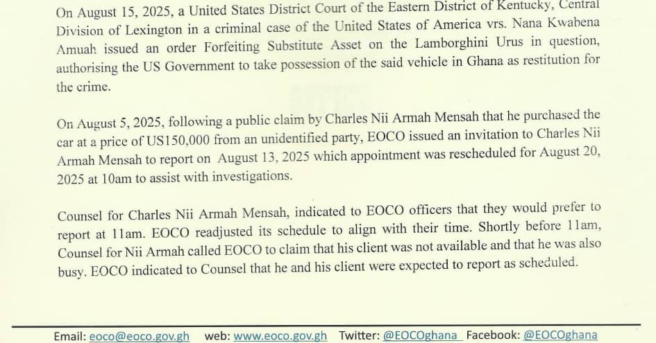 According to EOCO, the US Department of Justice and the FBI requested Ghanaian authorities to trace and recover the luxury vehicle as part of ongoing efforts to identify possible co-conspirators. On August 15, a US District Court in Kentucky ordered the forfeiture of the Lamborghini, authorising its transfer to the US government as restitution for the crime.