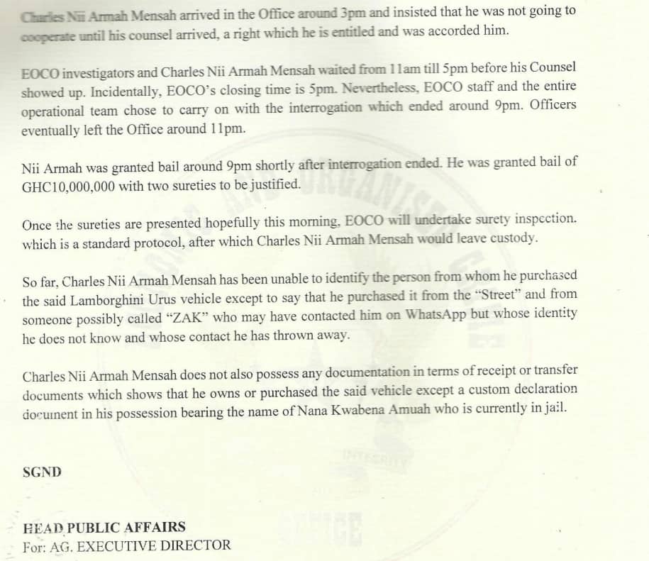 The agency disclosed that the artiste has so far failed to identify the individual who sold him the Lamborghini, except to say he purchased it “from the street” through a man possibly known as “Zak” whose contact details he no longer has. He also presented no proof of ownership or purchase documents, aside from a customs declaration bearing the name of Nana Kwabena Amuah.