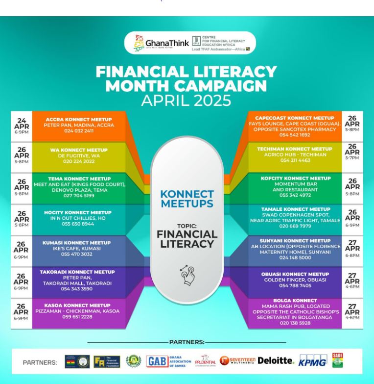 Spearheaded by the Center for Financial Literacy Education (CFLE) Africa, in collaboration with GhanaThink Foundation, a series of “Financial Literacy Month Konnect Meetups” have been taking place across the sixteen regions at various cities and towns. Konnect Meetups happened in Navrongo, Accra, Bolgantanga, Wa, Tamale, Sunyani, Kumasi, Koforidua, Ho, Tema, Techiman, and Obuasi. Cape Coast, Kasoa and Takoradi were rained off and new dates are to be scheduled as soon as possible. These meetups are happening throughout April, creating vibrant spaces for meaningful discussions and practical learning around financial literacy.