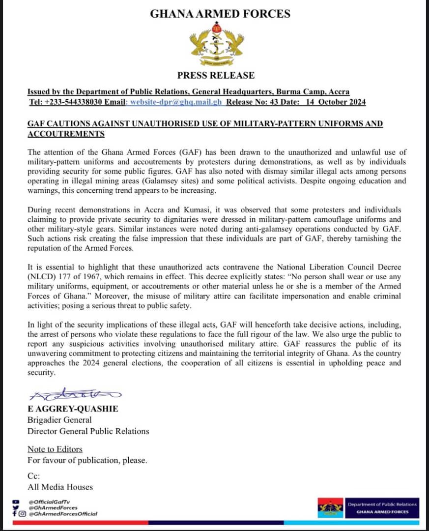 “It is essential to highlight that these unauthorised acts contravene the National Liberation Council Decree (NLCD) 177 of 1967, which remains in effect. Moreover, the misuse of military attire can facilitate impersonation and enable criminal activities, posing a serious threat to public safety.”