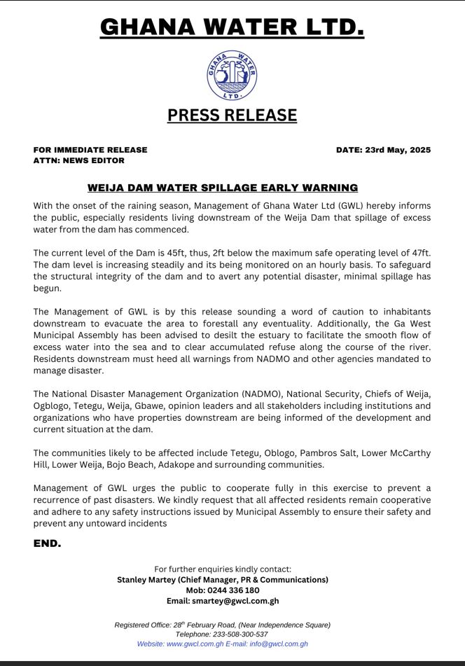 Ghana Water Limited (GWL) has initiated a controlled spillage of excess water from the Weija Dam following a steady rise in water levels prompted by the onset of the rainy season. The company issued an early warning to residents and stakeholders downstream, urging immediate precautionary measures to avert potential disasters.