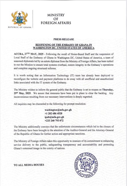 The Ministry of Foreign Affairs and Regional Integration of Ghana has announced the reopening of its embassy in Washington DC, effective Thursday, 29 May 2025.