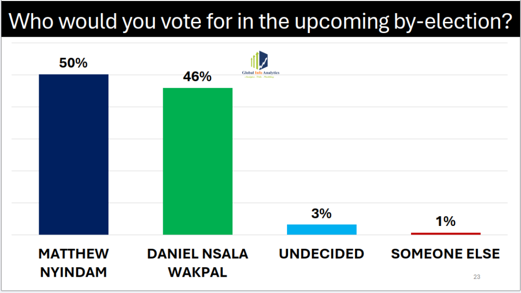 His closest contender, Daniel Nsala Wakpal, garnered 46 per cent voter support, suggesting a tightly contested race between the two leading candidates. Meanwhile, 3 per cent of respondents indicated they were undecided, while 1 per cent expressed support for other candidates.