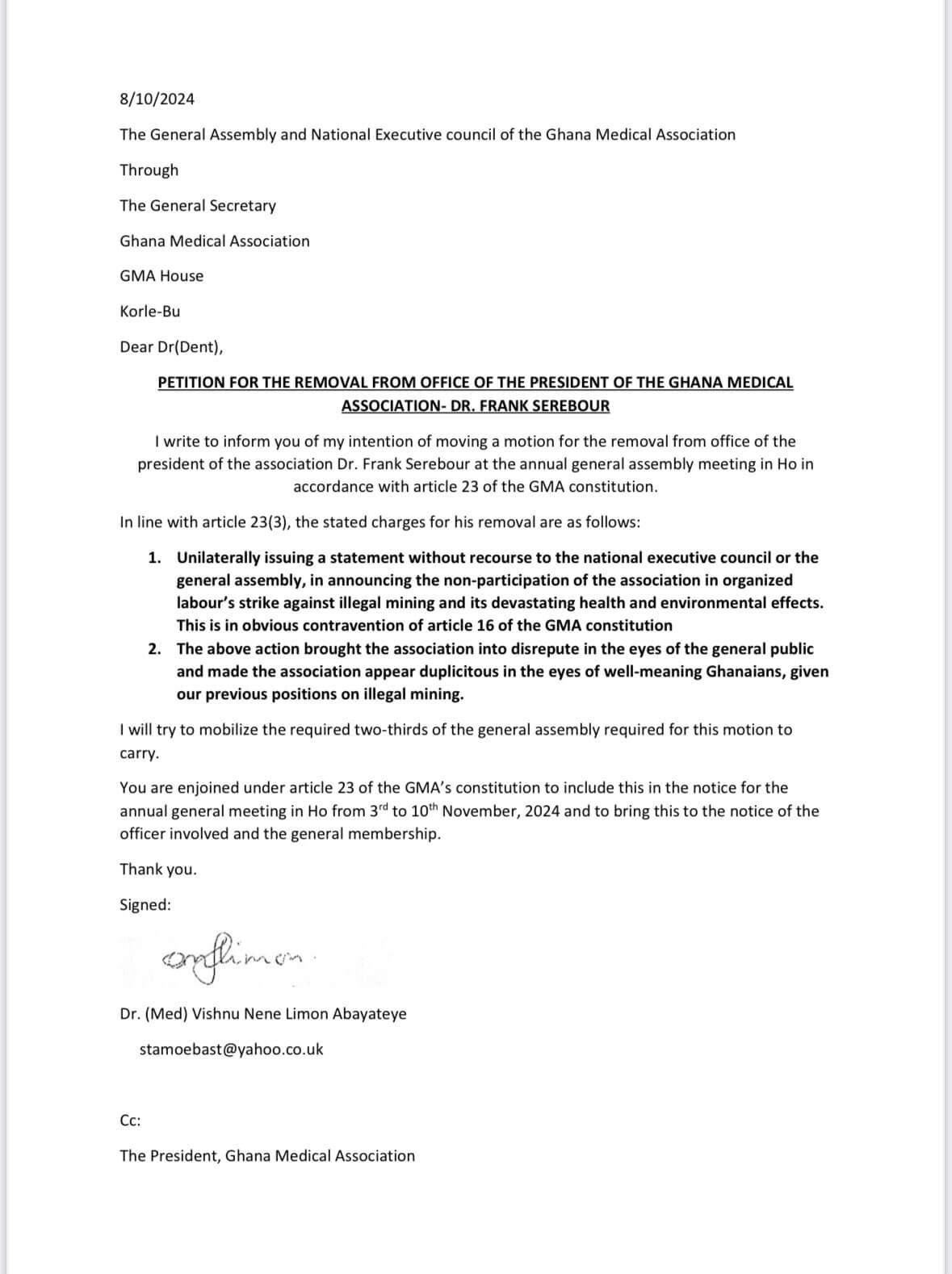 In his petition, dated October 8 and addressed to the GMA’s General Secretary, Dr. Abayateye accused Dr. Serebour of issuing a statement on behalf of the GMA without consulting the National Executive Council (NEC) or the General Assembly.