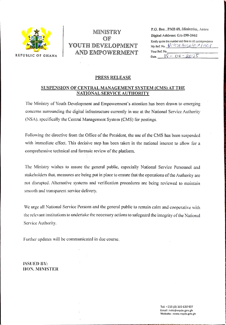 The Ministry of Youth Development and Empowerment has announced the immediate suspension of the Central Management System (CMS) used by the National Service Authority (NSA) for processing postings.