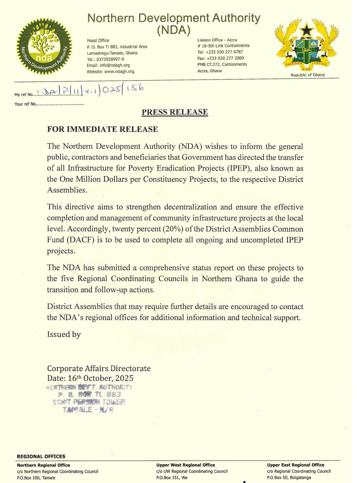 The Northern Development Authority (NDA) has announced that all Infrastructure for Poverty Eradication Projects (IPEP), popularly known as the “One Million Dollars per Constituency Projects“, has been officially transferred to the respective District Assemblies.