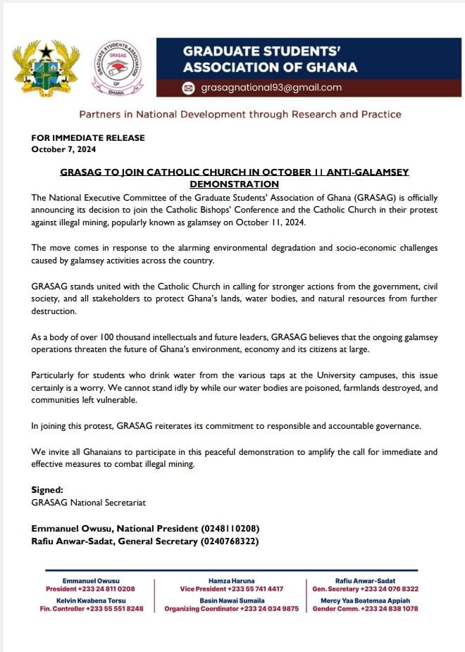 The National Executive Committee of the Graduate Students Association of Ghana (GRASAG) has announced its decision to join the Ghana Catholic Bishops Conference and the Catholic Church in their protest against illegal mining, commonly known as galamsey. The demonstration is scheduled for October 11, 2024.