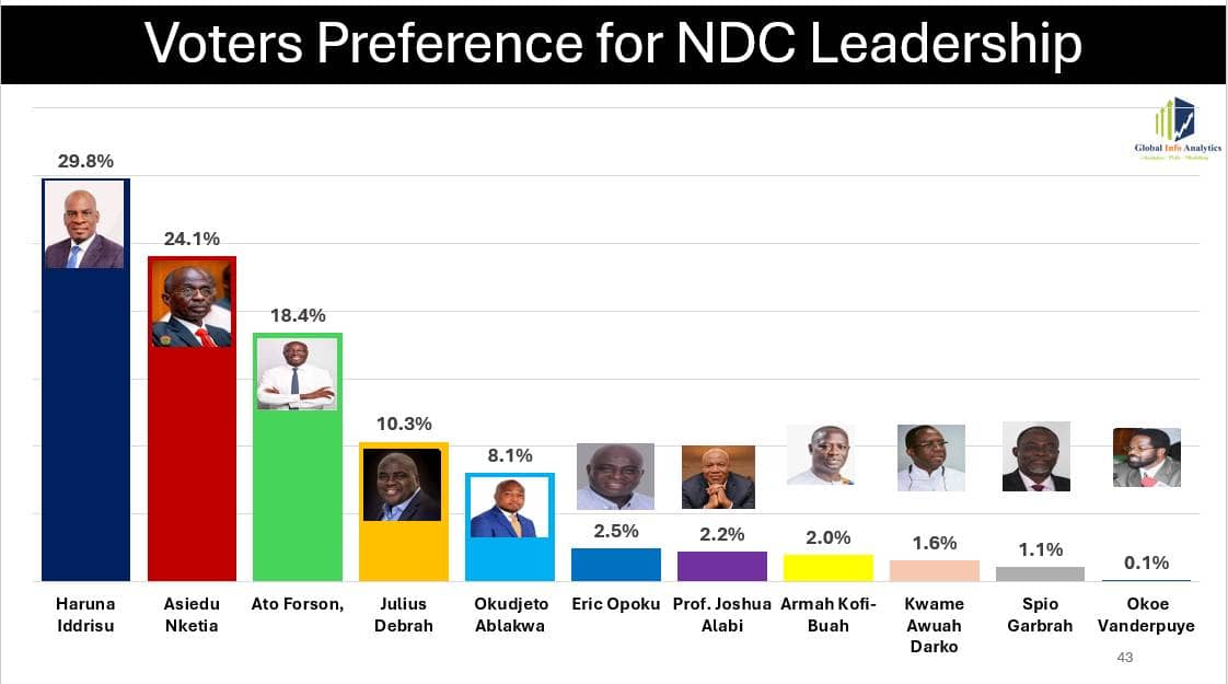 A new survey by research firm Global InfoAnalytics shows that Haruna Iddrisu, Minority Leader in Parliament, has emerged as the top choice among voters for future leadership of the opposition National Democratic Congress (NDC).