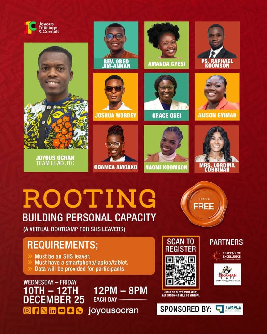 Joyous Trainings & Consult has successfully hosted a three-day virtual bootcamp designed to equip Senior High School (SHS) leavers with the knowledge, skills, and mindset required to navigate life after secondary education, while firmly grounding them in African heritage, identity, and personal development.