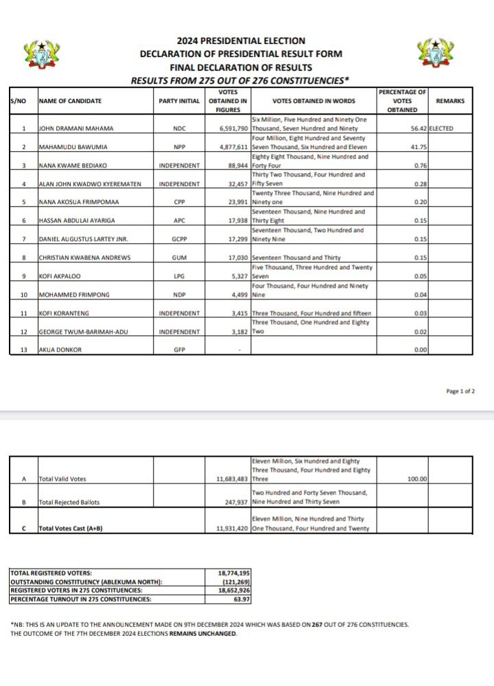 In the final tally, released on Friday, January 10, 2025, and covering 275 out of 276 constituencies, John Mahama obtained 6,591,790 votes (56.42%), defeating his closest contender, Mahamudu Bawumia of the New Patriotic Party (NPP), who garnered 4,877,611 votes (41.75%).