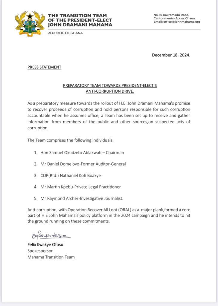“This team will receive and gather information from members of the public and other sources on suspected acts of corruption,” said Felix Kwakye Ofosu, spokesperson for the Mahama Transition Team.