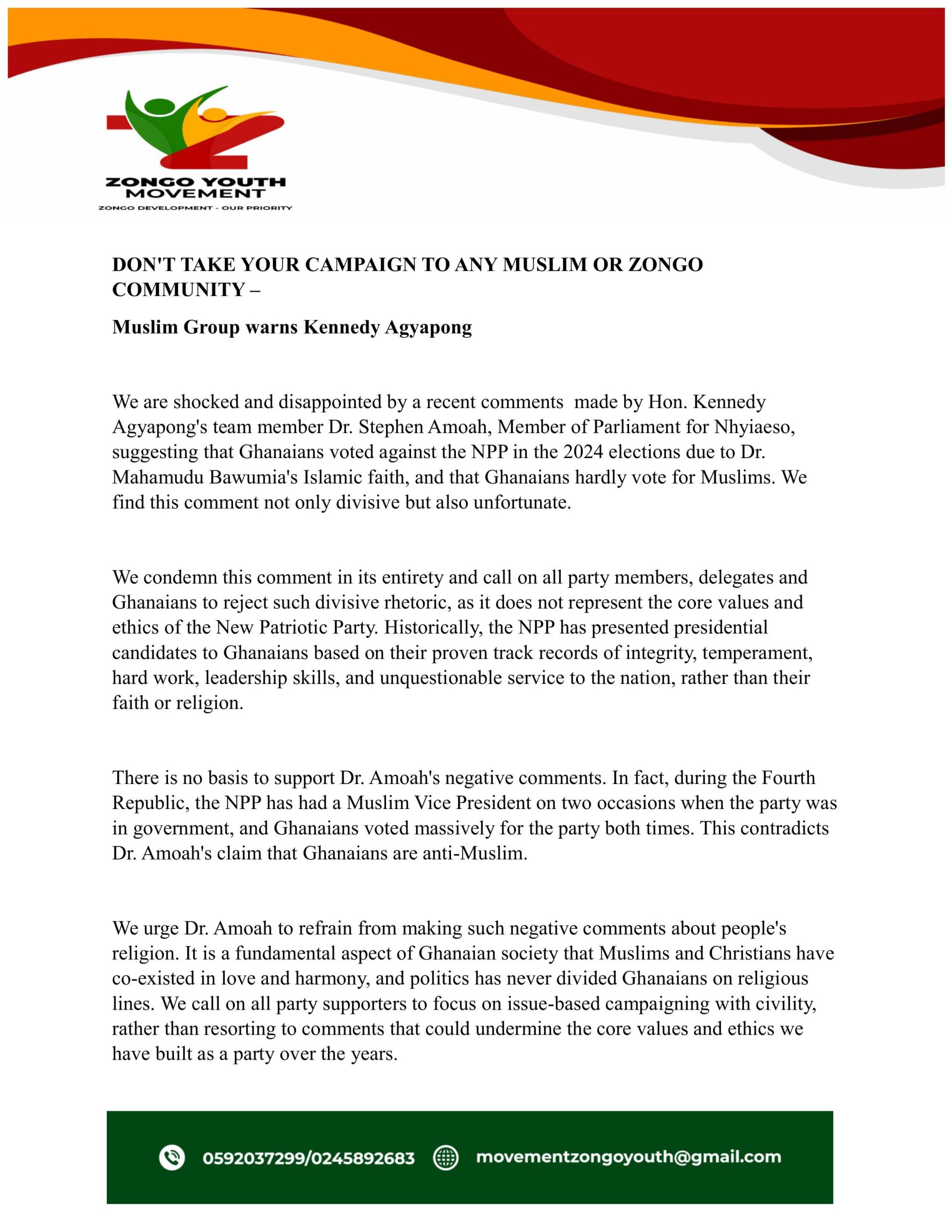 “We therefore warn Hon. Kennedy Agyapong and his team not to enter any Mosque, Muslim or Zongo Community with his campaign. He should stay away from all Muslim or Zongo activities and do his campaign elsewhere,” the group declared.