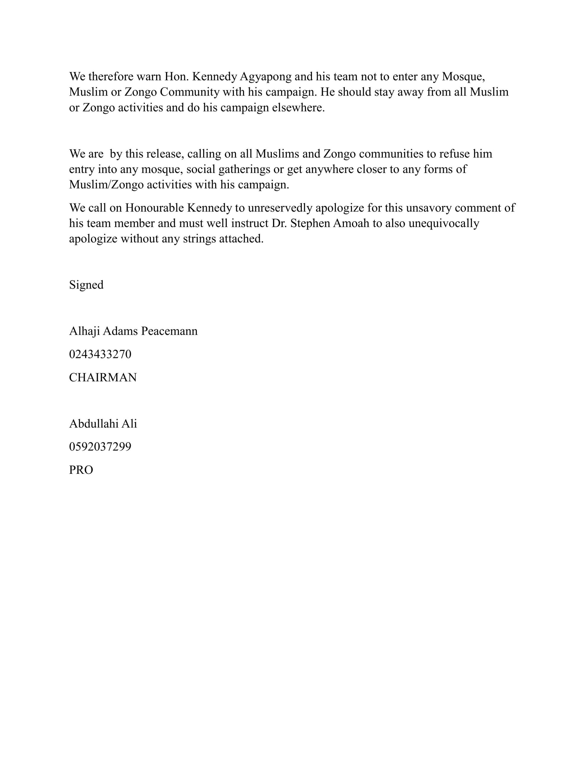 The group concluded by demanding an unqualified apology from both Kennedy Agyapong and Dr. Amoah.