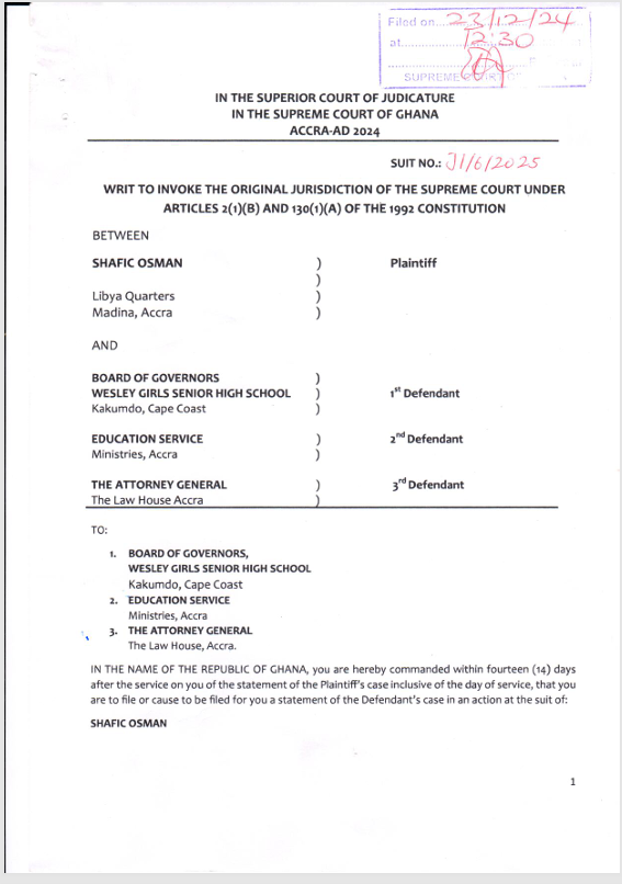 In a landmark case filed at the Supreme Court, Shafic Osman, a Ghanaian citizen, has brought legal action against Wesley Girls Senior High School, the Ghana Education Service (GES), and the Attorney General, challenging the school’s policy prohibiting Muslim students from practicing their faith on campus.