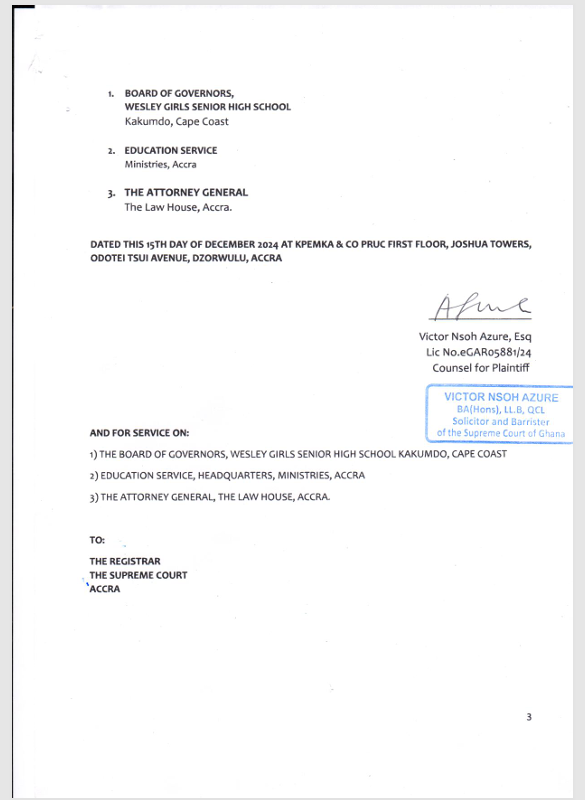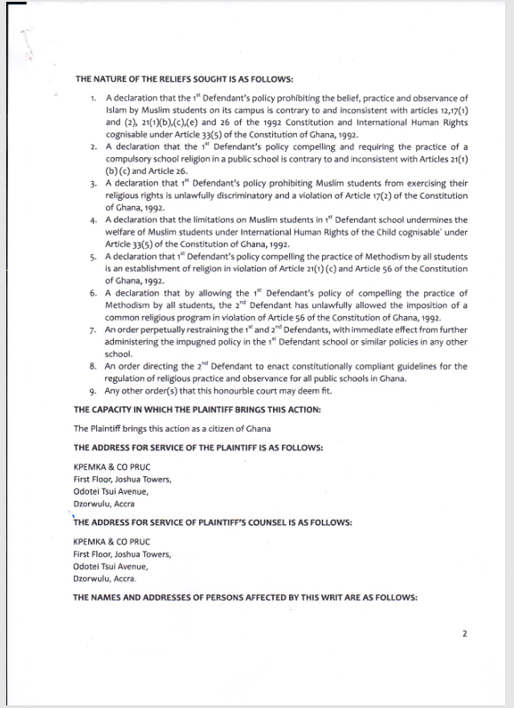 The plaintiff seeks several declarations from the court, including that Wesley Girls SHS’s policy violates constitutional rights to freedom of religion, non-discrimination, and the welfare of children as enshrined in the 1992 Constitution of Ghana.