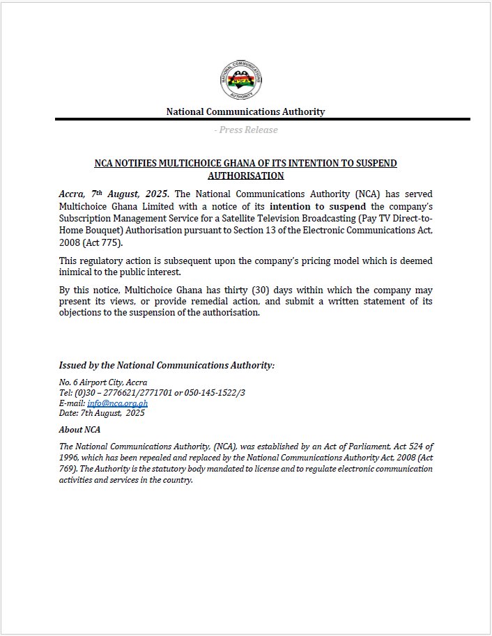 The National Communications Authority (NCA) has formally notified MultiChoice Ghana Limited of its intention to suspend the company’s authorisation to operate its Subscription Management Service for Satellite Television Broadcasting (Pay TV Direct-to-Home Bouquet), citing concerns over its pricing model.