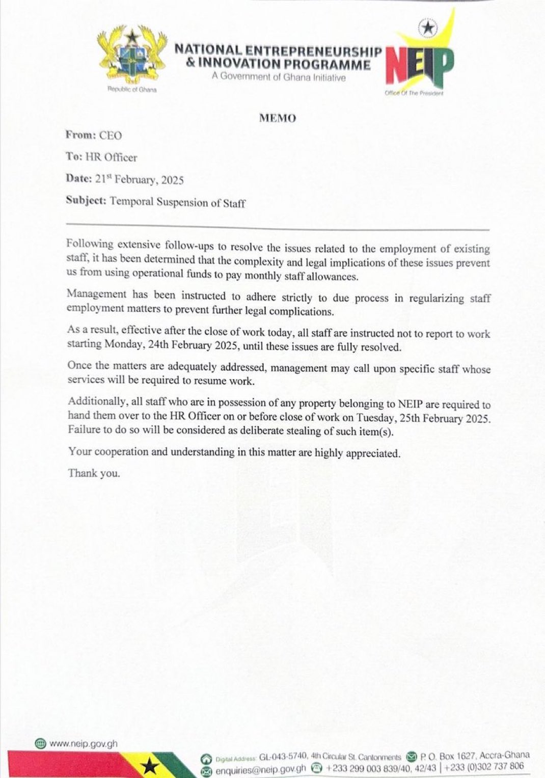 Additionally, staff in possession of any NEIP property have been ordered to return it to the HR Officer by Tuesday, February 25, 2025.