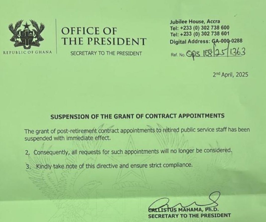 The notice, dated April 2, 2025, and signed by the Secretary to the President, Dr. Callistus Mahama, emphasized that “the grant of post-retirement contract appointments to retired public service staff has been suspended with immediate effect.”