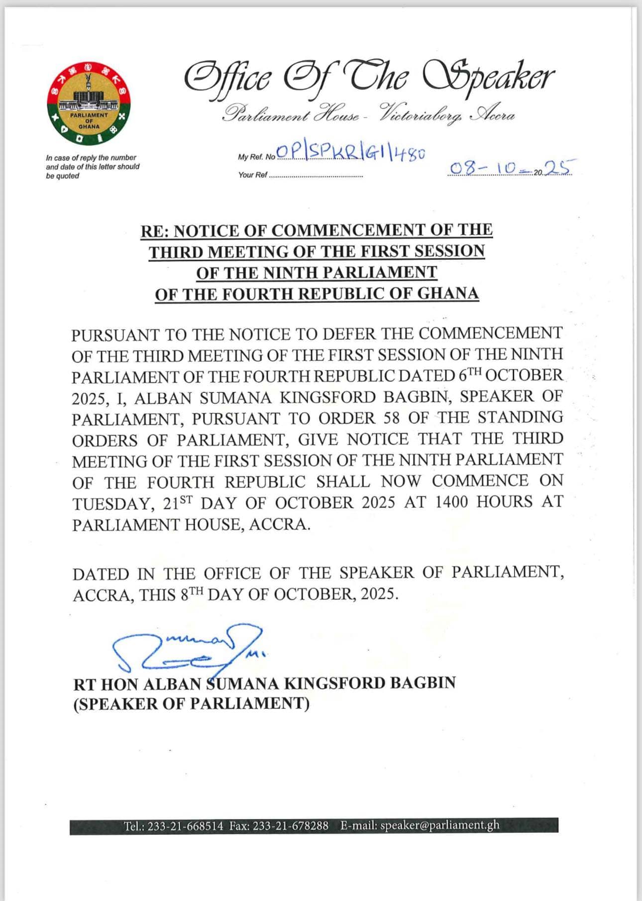 “Pursuant to Order 58 of the Standing Orders of Parliament, I give notice that the Third Meeting of the First Session of the Ninth Parliament of the Fourth Republic shall now commence on Tuesday, 21st day of October 2025 at 1400 hours at Parliament House, Accra,” the statement read.