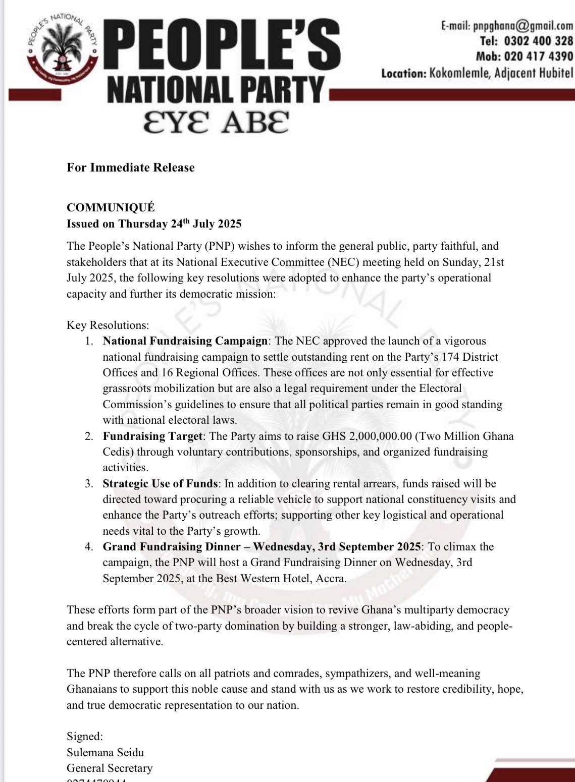 A communiqué issued on Thursday following a National Executive Committee (NEC) meeting held on July 21 outlined several key resolutions, including a fundraising target of GHS 2 million. The funds, according to the party, will be used to pay outstanding rent on all 174 district and 16 regional offices and to strengthen the party’s logistical and outreach capabilities.