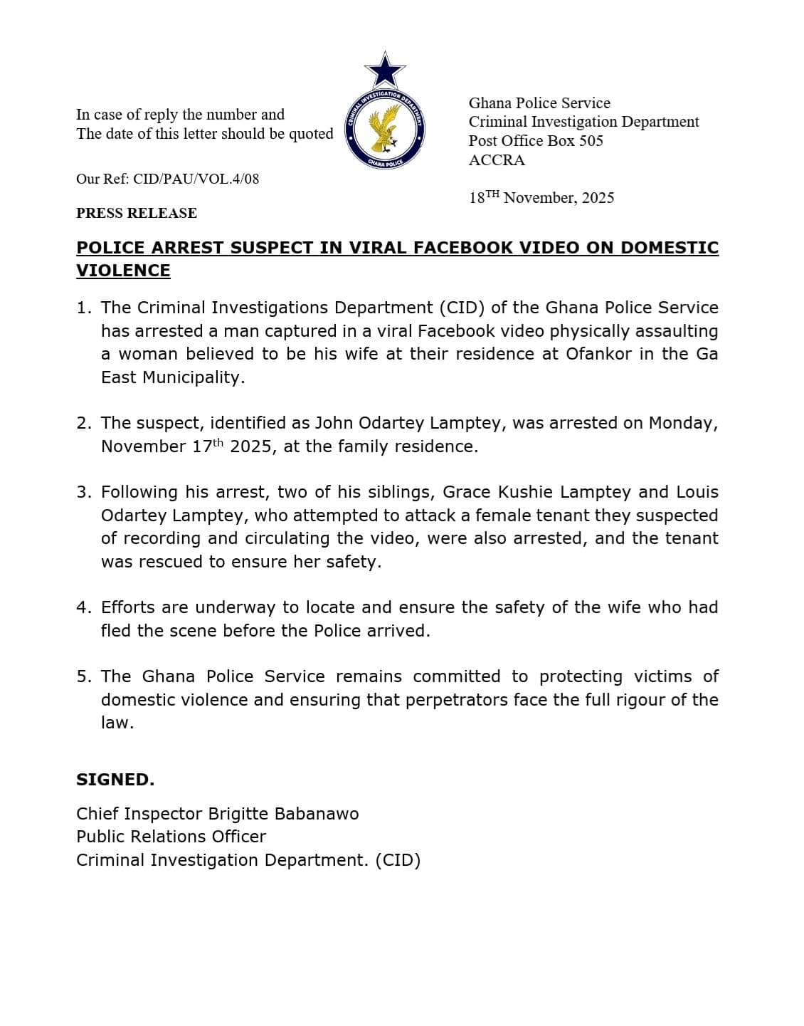 According to the statement, two of his siblings — Grace Kushie Lamptey and Louis Odartey Lamptey — were also arrested after they allegedly attempted to attack a female tenant they suspected of recording and circulating the video. Police said the tenant “was rescued to ensure her safety.”