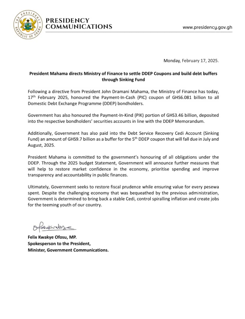 President John Dramani Mahama has instructed the Ministry of Finance to settle outstanding coupons under the Domestic Debt Exchange Programme (DDEP) and establish a financial buffer through the Sinking Fund.