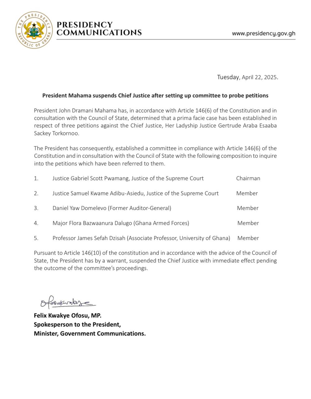 In a statement issued by the Presidency, Spokesperson to the President and Minister for Government Communications, Felix Kwakye Ofosu, confirmed that the Chief Justice has been suspended with immediate effect pending the outcome of the committee’s work, in accordance with Article 146(10) of the Constitution.