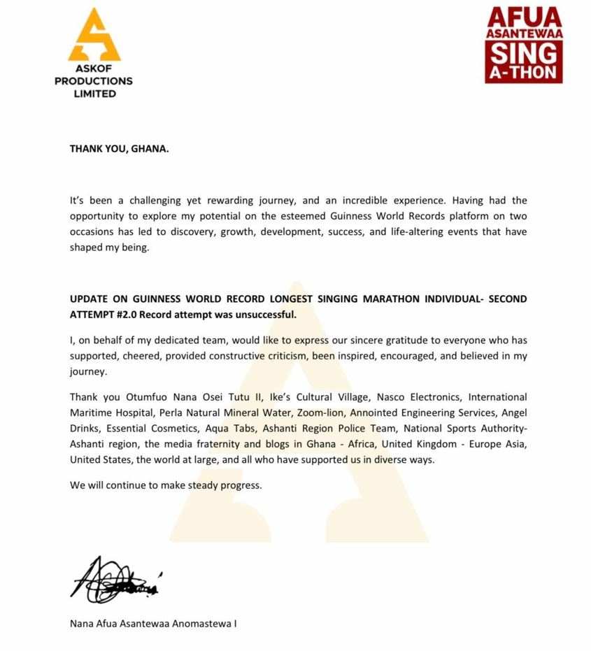 Ghanaian media personality and entrepreneur, Afua Asantewaa Aduonum, has announced that her second attempt to break the Guinness World Record (GWR) for the longest individual singing marathon was not successful.