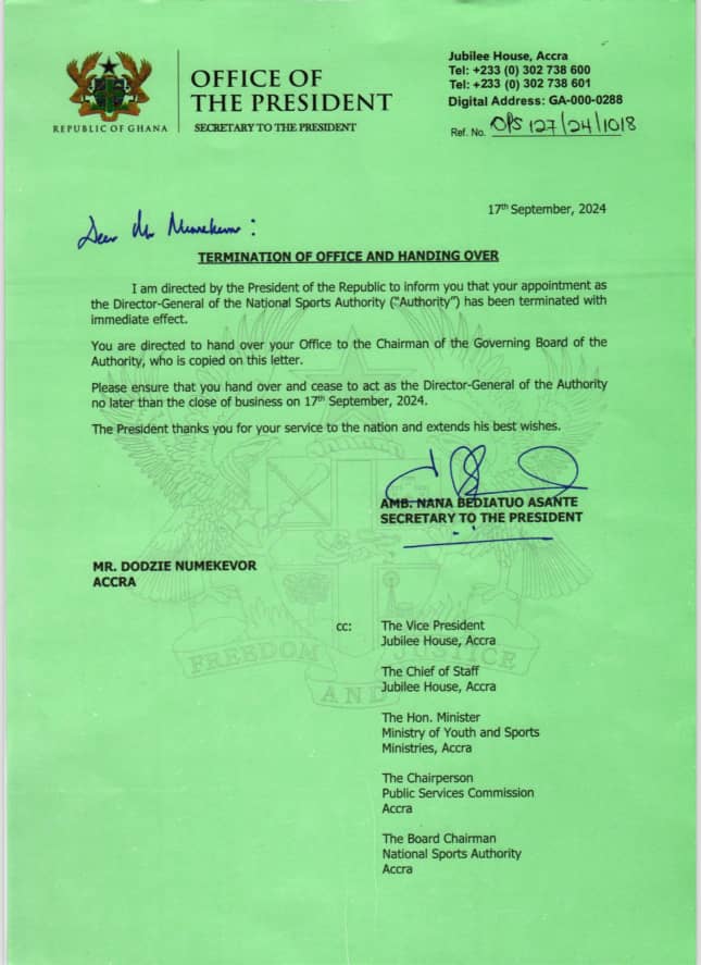 The letter, signed by Secretary to the President, Ambassador Nana Bediatuo Asante, did not provide reasons for the dismissal but directed Numekevor to hand over office to the Chairman of the NSA Governing Board.