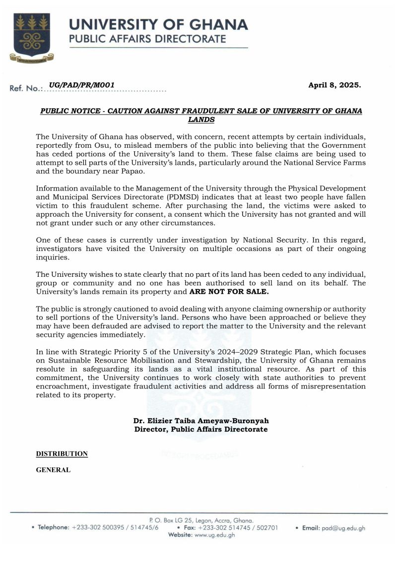 The University of Ghana has issued a stern warning to the general public against fraudulent attempts by individuals claiming ownership of portions of its land, particularly around the National Service Farms and the Papao boundary.