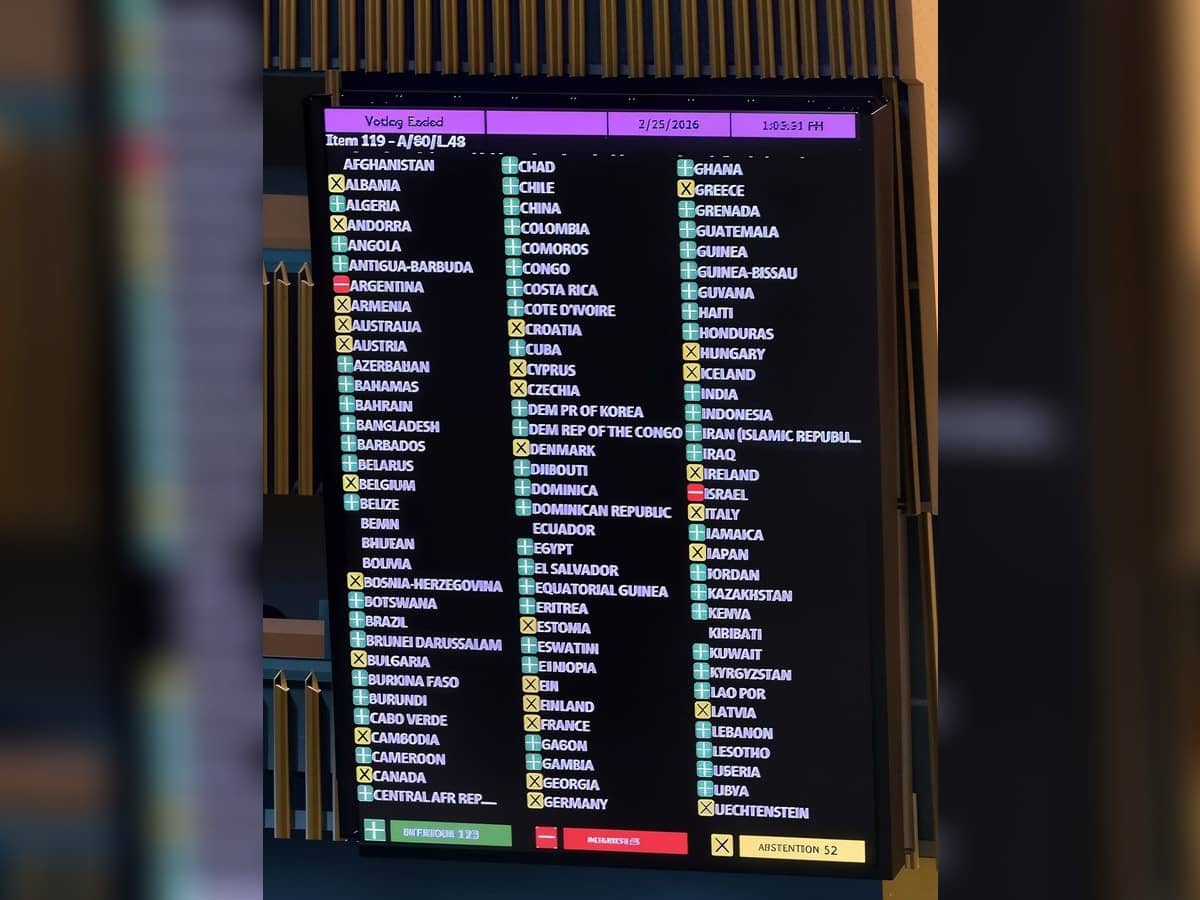 A voting board displayed at the Assembly on March 25, 2026, showed 123 countries backing the resolution, with three, including United States, Argentina and Israel, voting against, while 52 nations abstained.