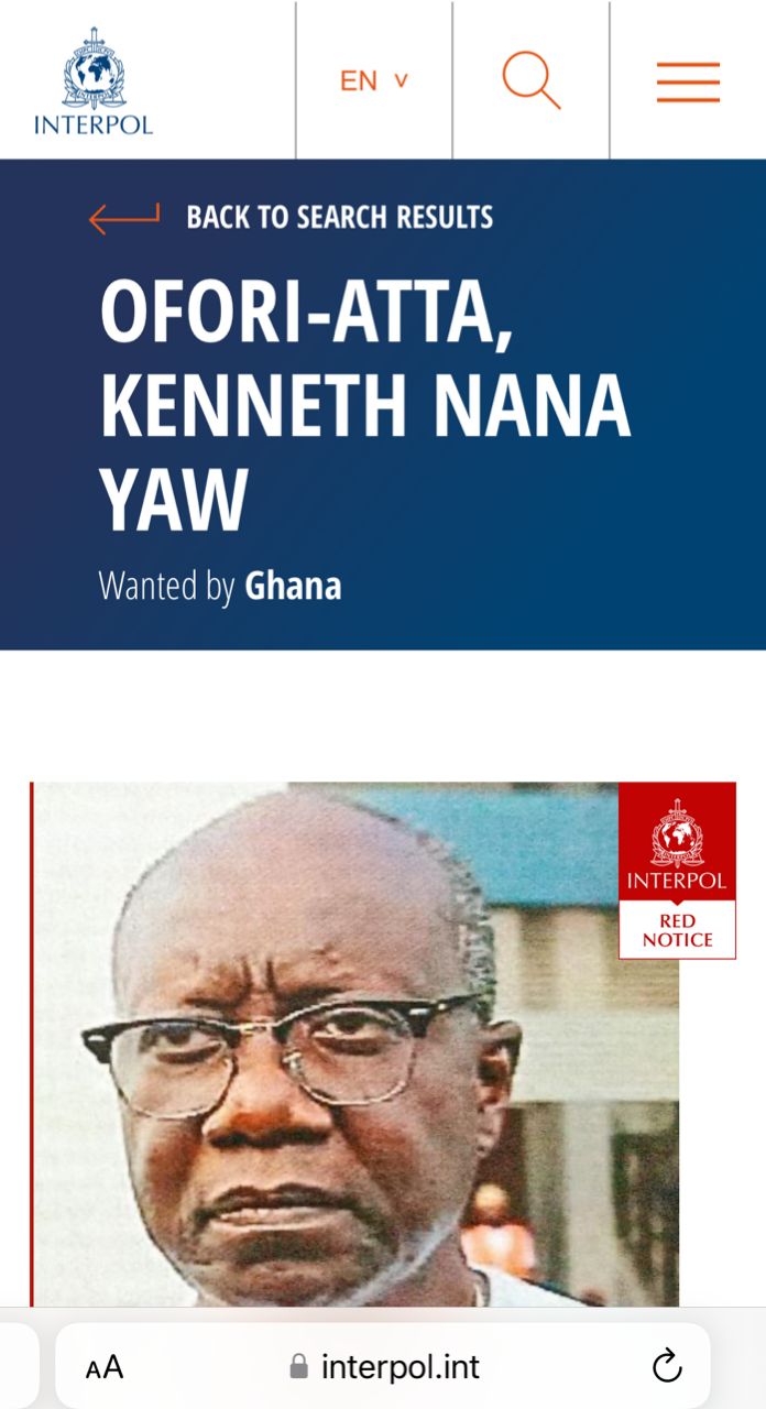 On Interpol’s platform, the charge against Ofori-Atta is listed as “using public office for profit,” along with a description of his physical features.