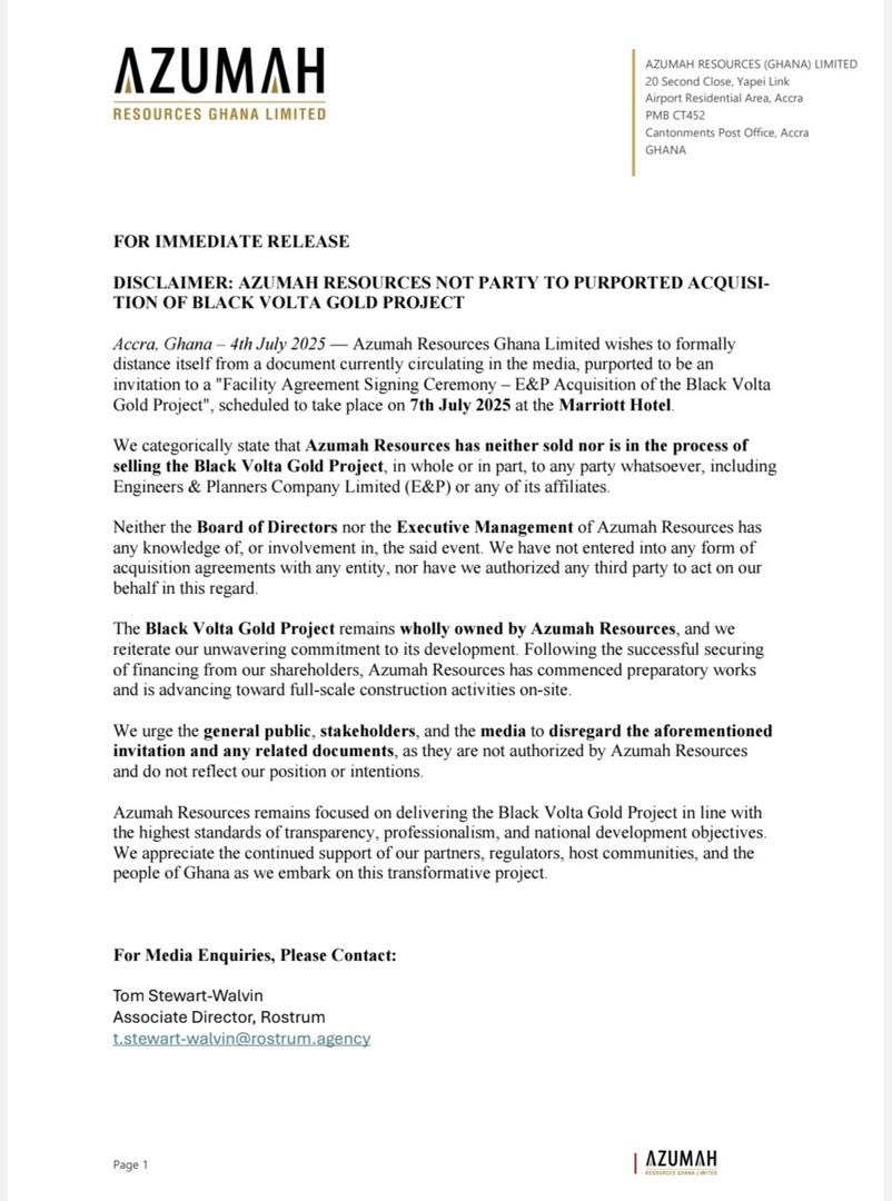 Azumah Resources Ghana Limited has publicly denied claims that it is involved in the sale of the Black Volta Gold Project, distancing itself from a document circulating in the media which references a purported signing ceremony between the company and Engineers & Planners (E&P).